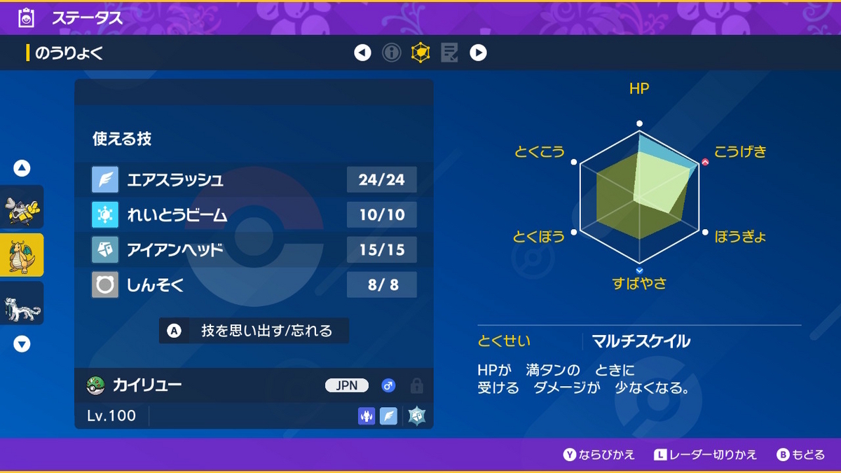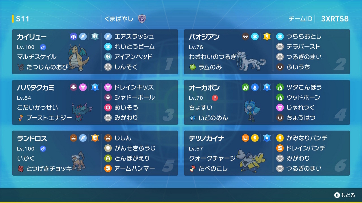 今まで4wカイリューに抵抗あったのだが、シーズン中盤にスケショ/アイへ/神速/蹴手繰りカイリューを使ったり弱保カイリューを使っていたため、アレルギーは消えた。4wカイリュー、技範囲の広さがバグでマジで強いから試したことない人は試してみて欲しい。