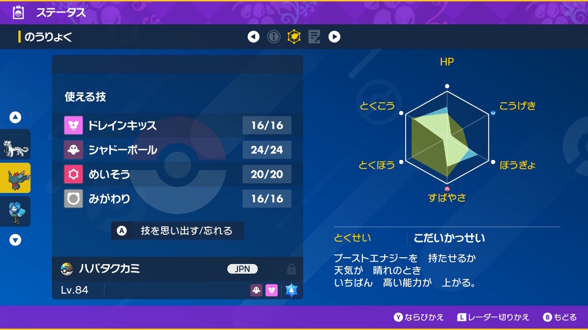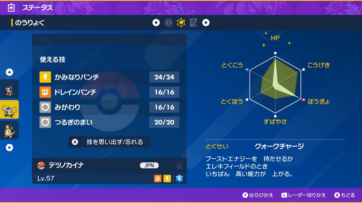 また、カイリューの代わりに初手に出すことも多く、初手に投げて相手が特殊アタッカーならそのまま居座り、物理アタッカーなら威嚇込でテツノカイナが受けられるのでテツノカイナに引くことで初手おきも安定した。