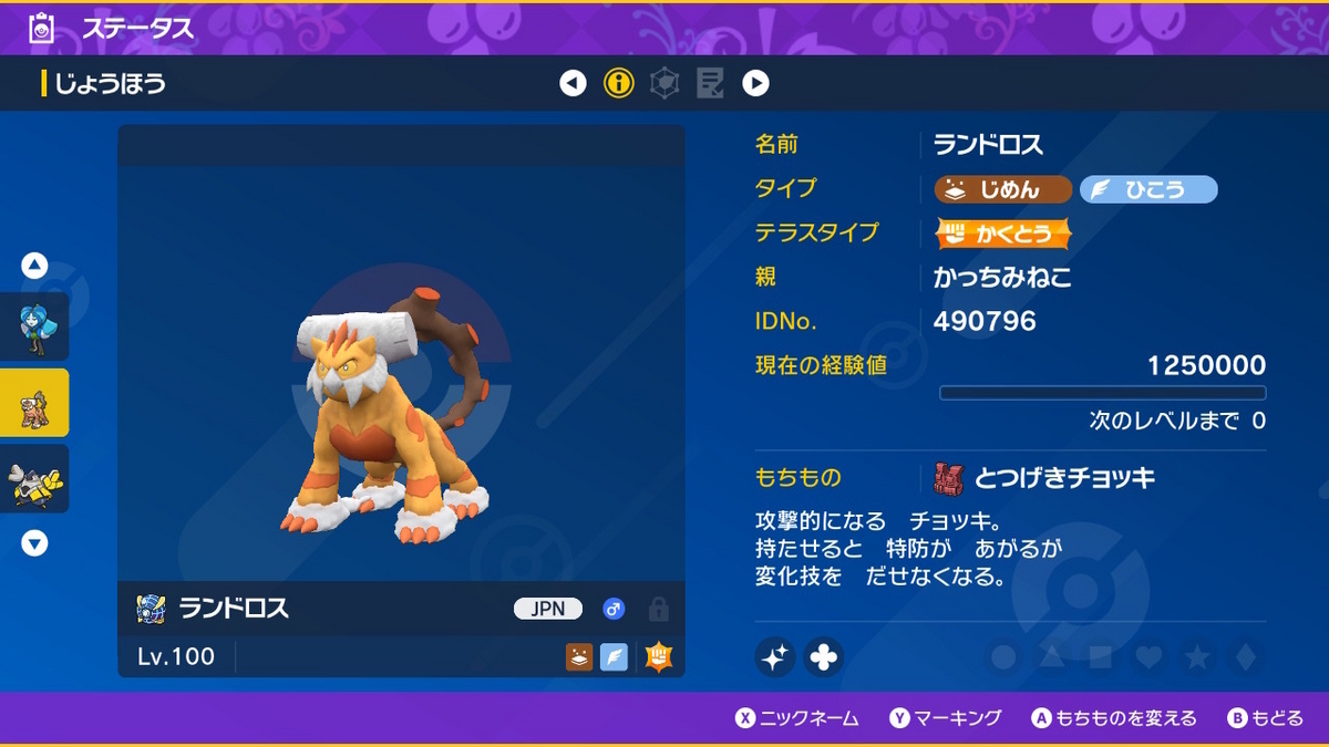 次に対特殊ポケモンを考えた際に、威嚇とテツノカイナの相性が良いと考え、HDに厚いランドロスを考えた。最初はHDオボンで考えていたが、甘えるカミが多く、役割遂行出来ないことが嫌だったのでA特化のチョッキランドロスを採用した。
