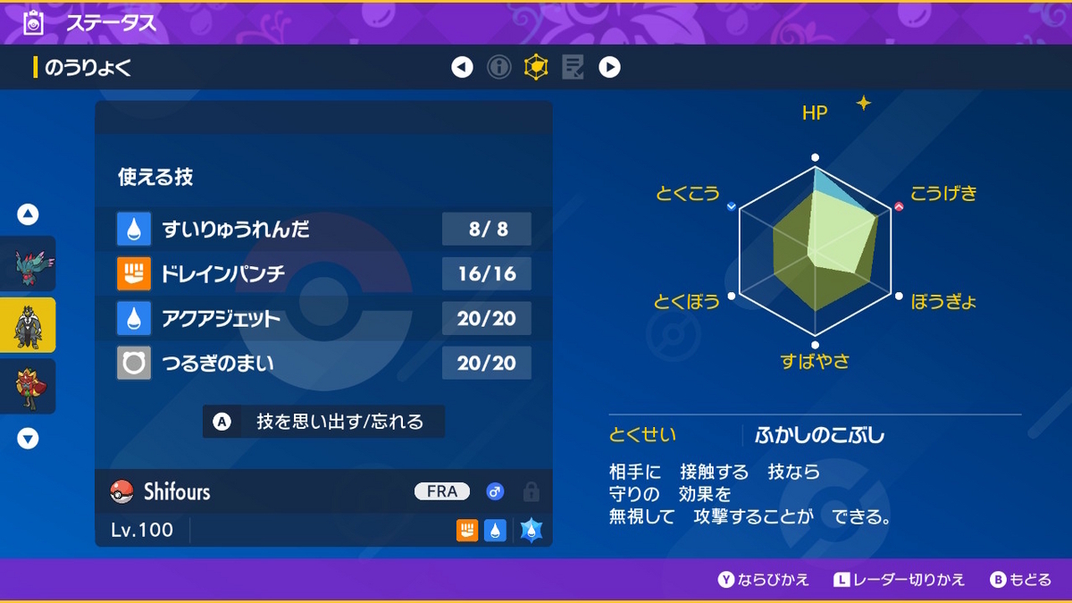 H実数値は残飯効率を高めるために193、s実数値は耐久ウーラオスを確実に抜ける且つ、麻痺状態のスカーフウーラオスを抜けるように実数値124にした。このお陰で渦アンコカイリューミラーでは抜かれたことは無かった。