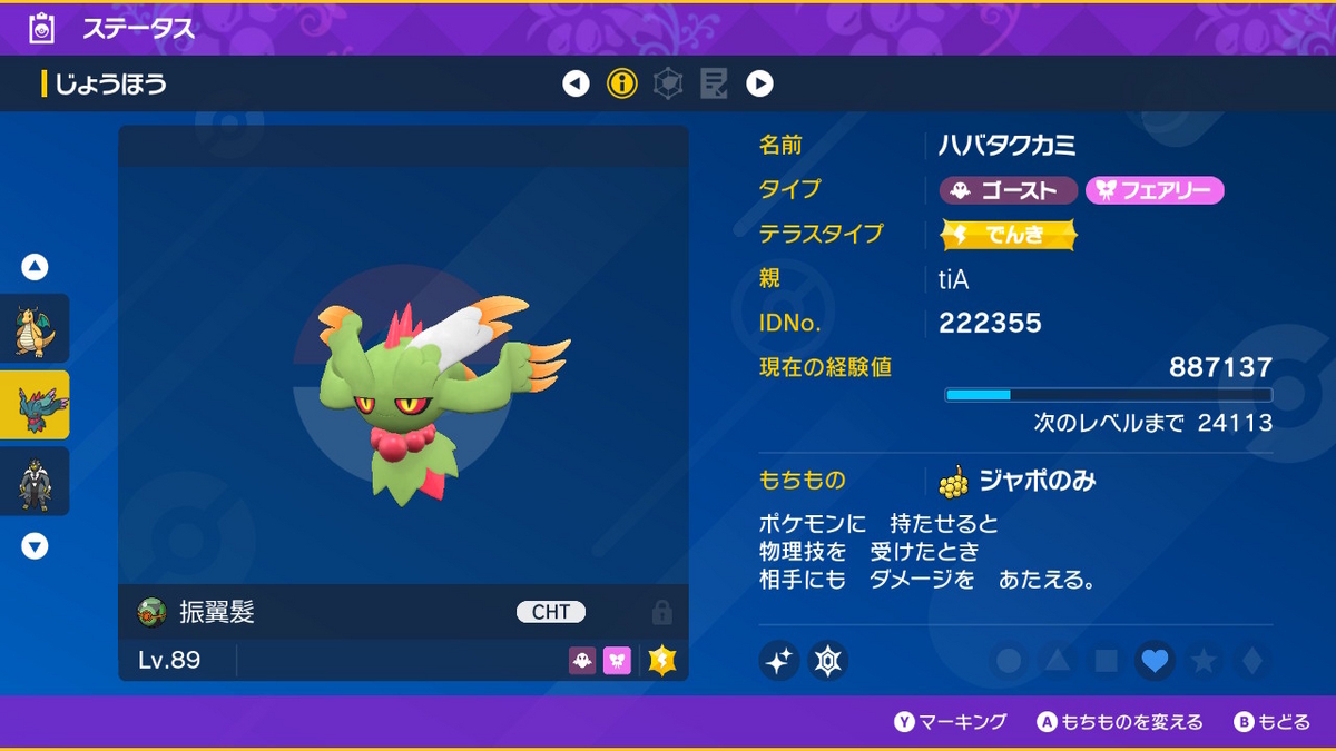 ここまででカイリュー、ガチグマ、ラオス、オーガポン、ジバコイルの5体が決まり、ラスト1枠としてはタイプや性能も考えて、ハバタクカミを採用したいと考え、カイリューが出しにくい構築に対しての電磁波によるS操作+初手ガッサへの対応+絡め手構築への対応という点も考えて、ハバタクカミの型をジャポ型で採用して構築は完成しました。